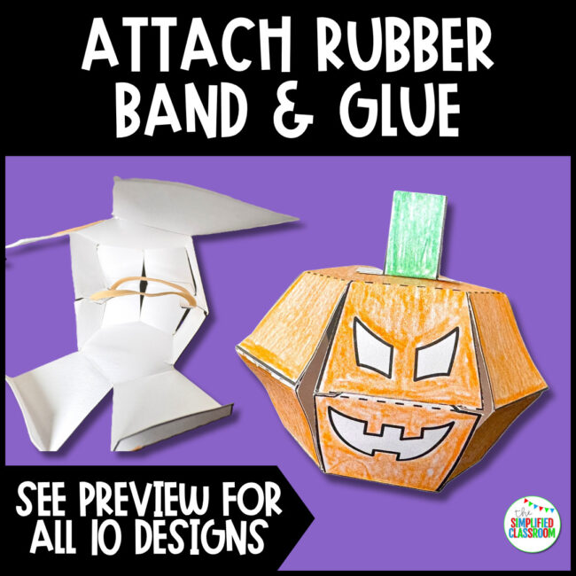 - Then, to bring the pumpkin to life, students will insert a rubber band inside to connect the top and bottom parts.