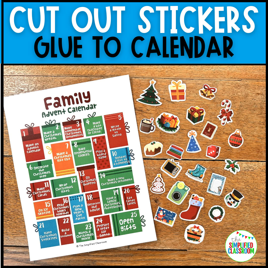 Also Included: One page of colorful holiday-themed stickers to cut out and glue onto each day’s box as you complete activities!