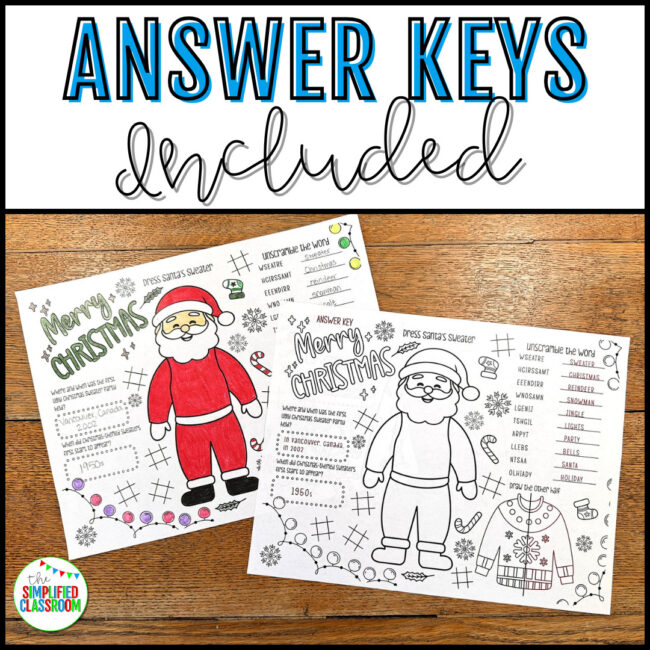 These printable mats areย black-and-white for easy photocopying and coloring, making them great for classroom use or take-home packets. Kids will love the interactive activities, while youโll love how they encourageย critical thinking, creativity, and holiday cheerย – all in one festive resource!