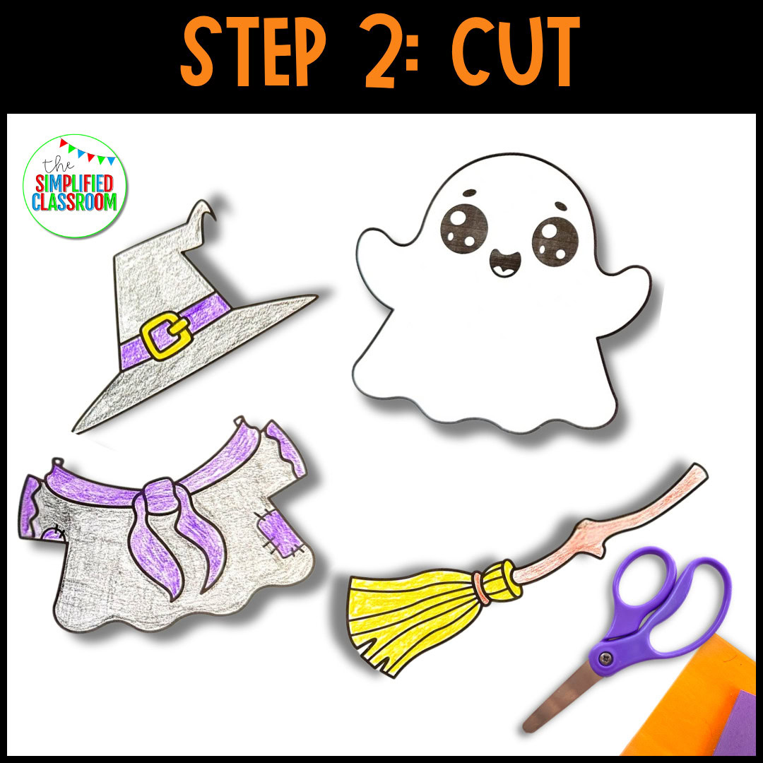Next, they cut and assemble their ghosts in this hands-on cut-and-paste craftivity, which seamlessly combines art with fine motor skill practice. Then, with the included simple writing component, students get the opportunity to complete the prompt, expressing their ideas and developing early writing skills.