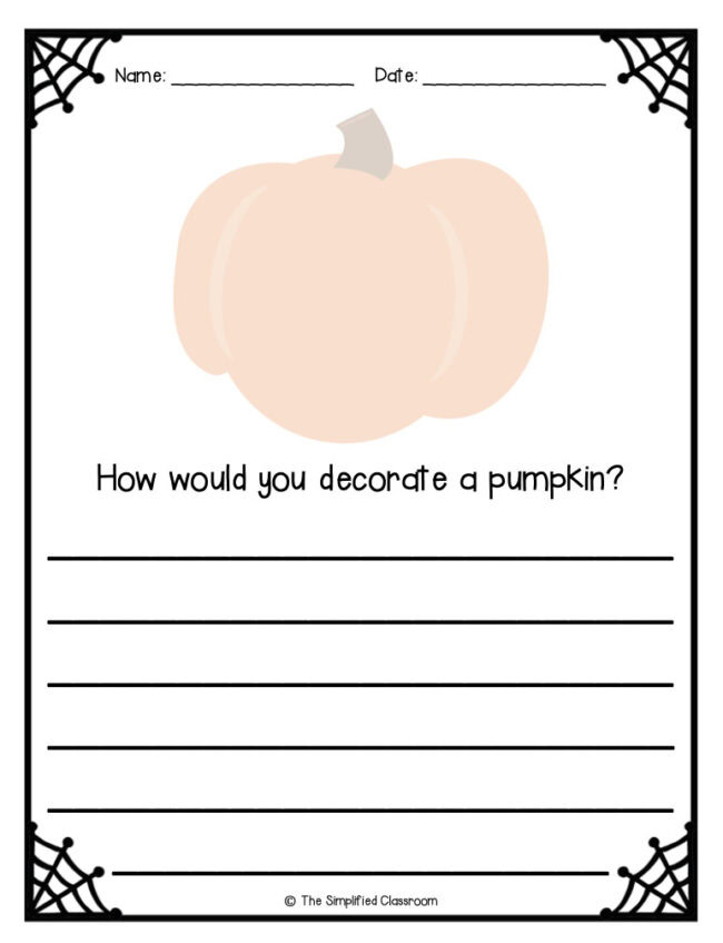 This free writing paper asks students to write about how they would decorate a pumpkin! I used it in my classroom during our “pumpkin week” and it was fun to see all my students’ creative ideas!