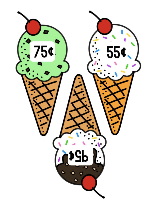 Practice money with these fun ice cream scoops! Students can use real or pretend money to “pay” for their ice cream cones!