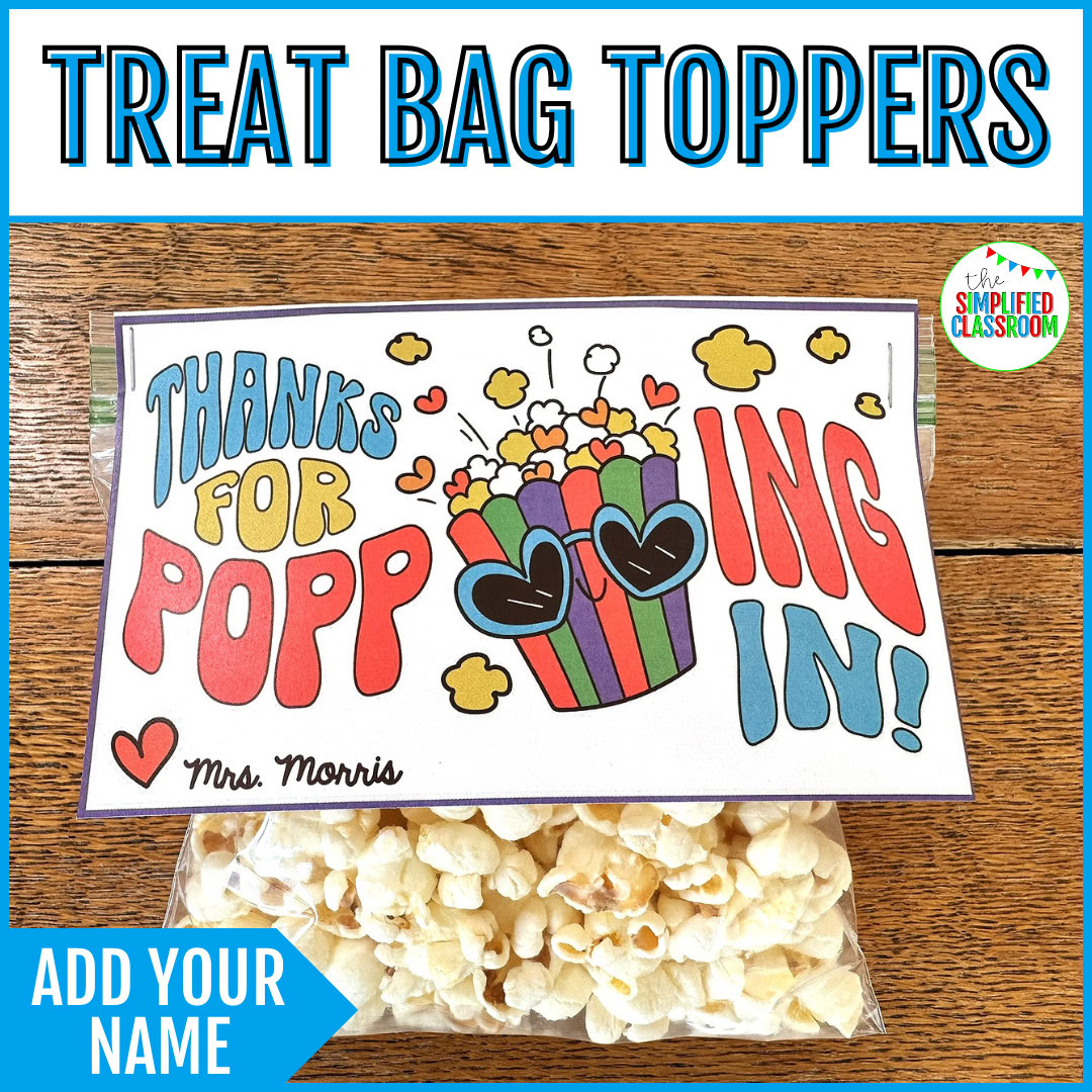 Looking for fun Back to School Gift Tags for Open House or Back to School Night? These Popping In Tags Open House treat tags make it easy to create a memorable first impression with your students and their families. Not only do they feature the playful “Thanks for Popping In” message, but they also double as treat bag toppers or gift tags, making your welcome extra festive and thoughtful. Additionally, these tags pair perfectly with popcorn or other small treats, adding a fun and interactive element to your classroom event.