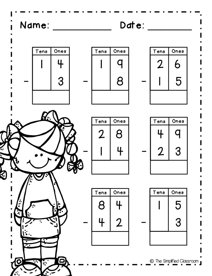 I would print the first 2 back-to-back and use them to teach the concept of subtracting double digit numbers (with an emphasis on place value). Then, you can have students practice what they have learned with the third and/or fourth pages! 🙂