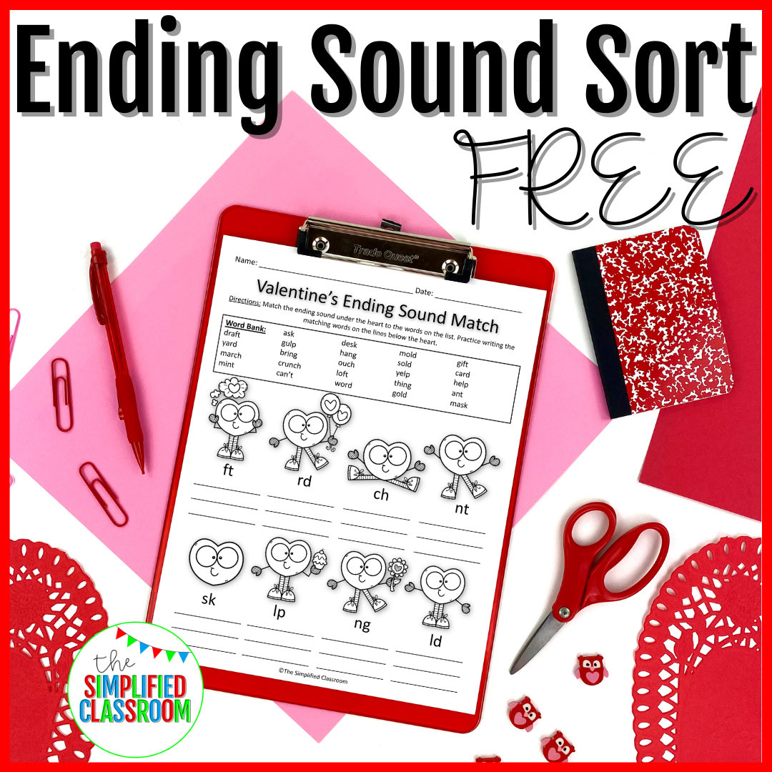 FREE Valentines Literacy Worksheet Ending Sounds Sort