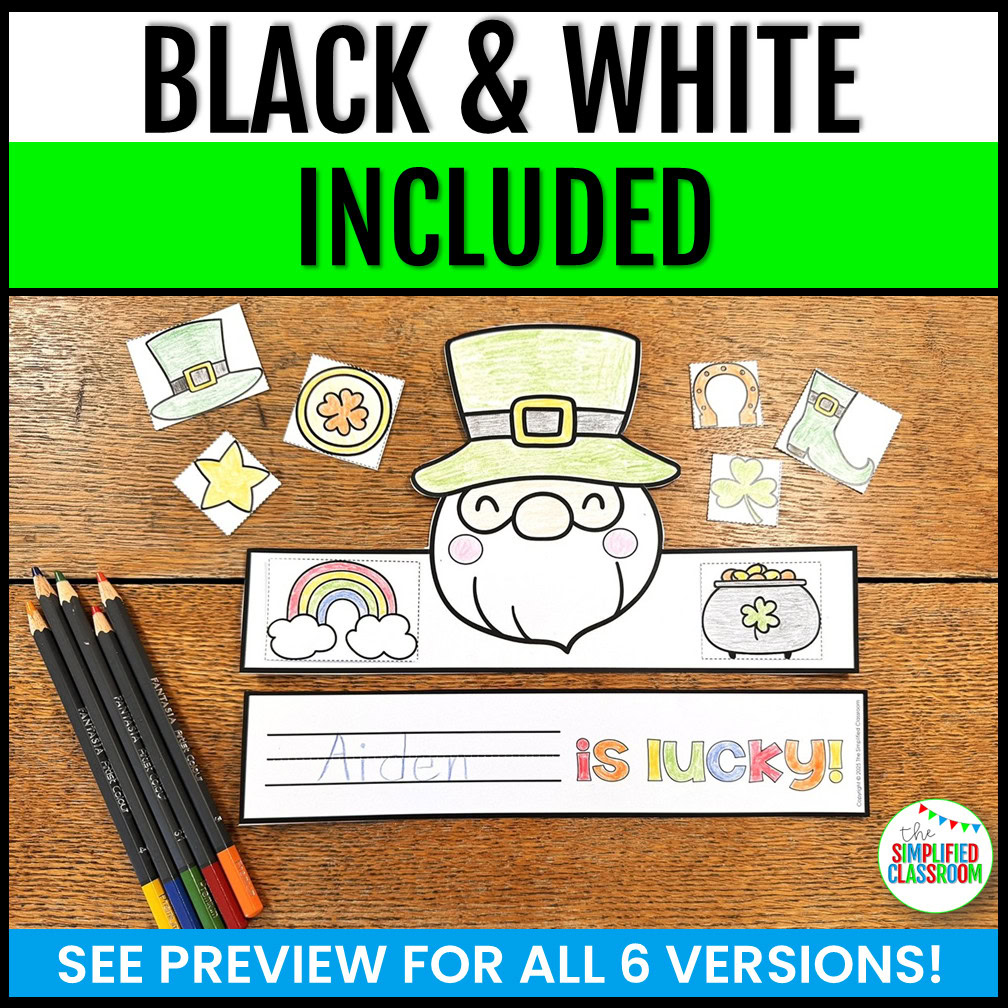 - Style 5: Another option to give your students practice writing, cutting and pasting! Students can cut out the cute decorations and paste them on the front of the headband. On the back, students add their name in the space provided to start the sentence “_________ is lucky!”