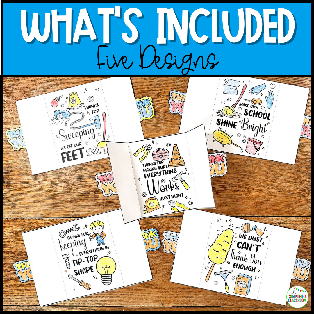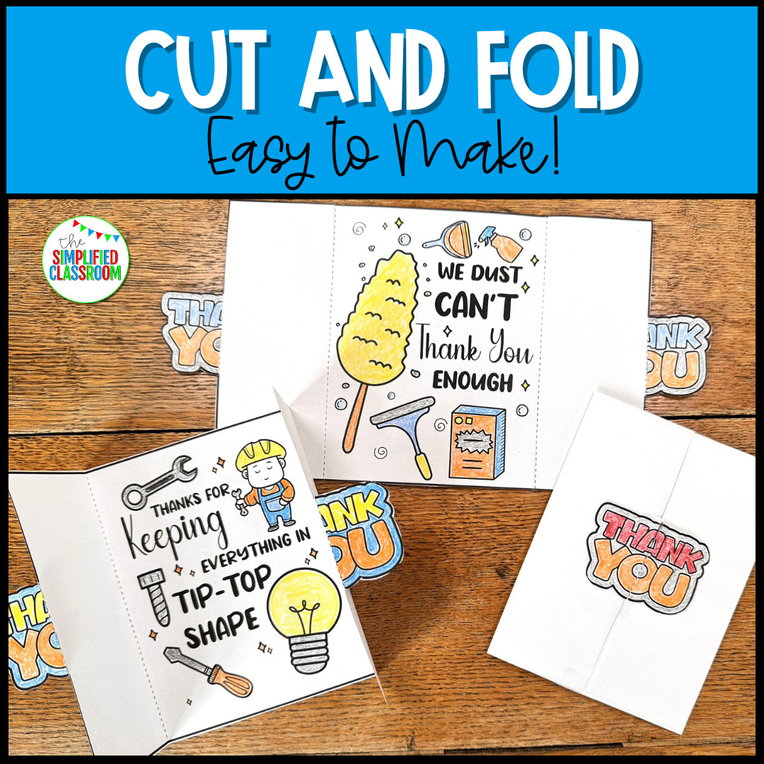 Moreover, because these cards are quick to prepare and easy for students of all ages, they are a wonderful way to promote kindness and gratitude throughout the school. In addition, since each design highlights the important role custodians play, the activity not only celebrates National Custodian Day but also encourages students to notice and value the people who keep their learning environment safe and clean. Therefore, by using these thank you cards, you not only create a fun classroom project but also foster a stronger sense of school community and appreciation.