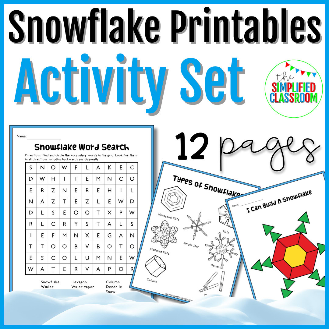 – A PDF file with snowflake cycle exploration, name identification, snowflake shape templates, a word search, a creative writing sheet, symmetry practice, and fascinating snowflake fact sheets.