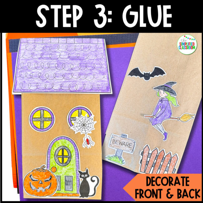 Then, glue the decorations onto a paper bag to build your haunted house masterpiece.