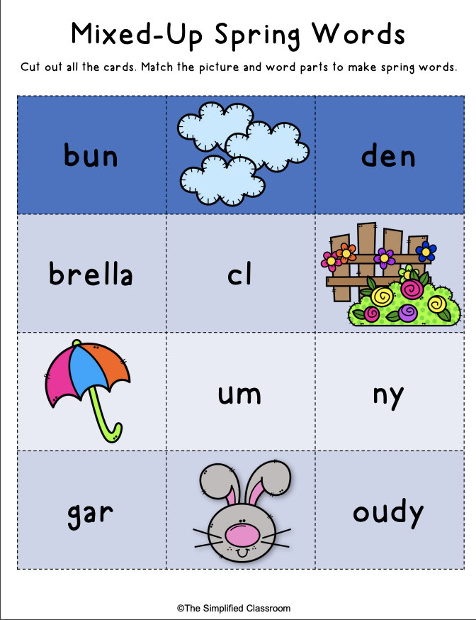 3. Students will love building spring words with the mixed-up spring words matching activity! Students will match up the cards that have a picture and two word parts to make a word and picture match. Students will love this interactive word-building activity.