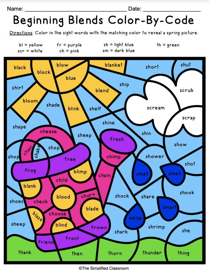 Lastly, I included a spring color-by-code activity where students will color in the shapes based on beginning blend spelling and sounds. For example, they will find all the shapes with words that begin with “th” and color them green. Students just love this type of activity and stay engaged while practicing reading beginning blends.