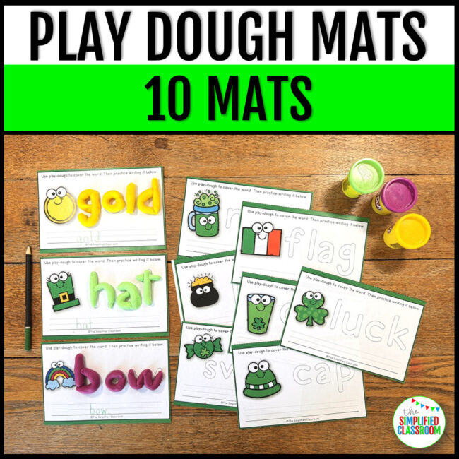 Perfect for St Patricks Day literacy activities in your classroom! This engaging set includes 6 fun and interactive literacy centers designed for kindergarten, first, and second grade students. Activities include a long and short vowel word sort, two St. Patrick’s Day writing prompts, picture-to-word matching cards, play-dough word building mats, a reading comprehension activity, and a word building challenge.