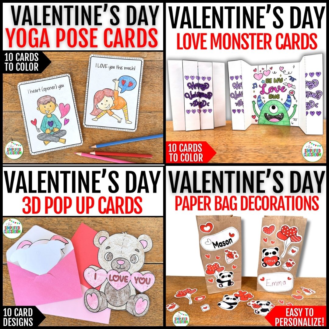 - Valentine’s Day Yoga Cards: Coloring Valentine’s Day movement cards that combine yoga poses with kid-friendly Valentine themes. These cards double as coloring valentines and are ideal for brain breaks or calm movement.