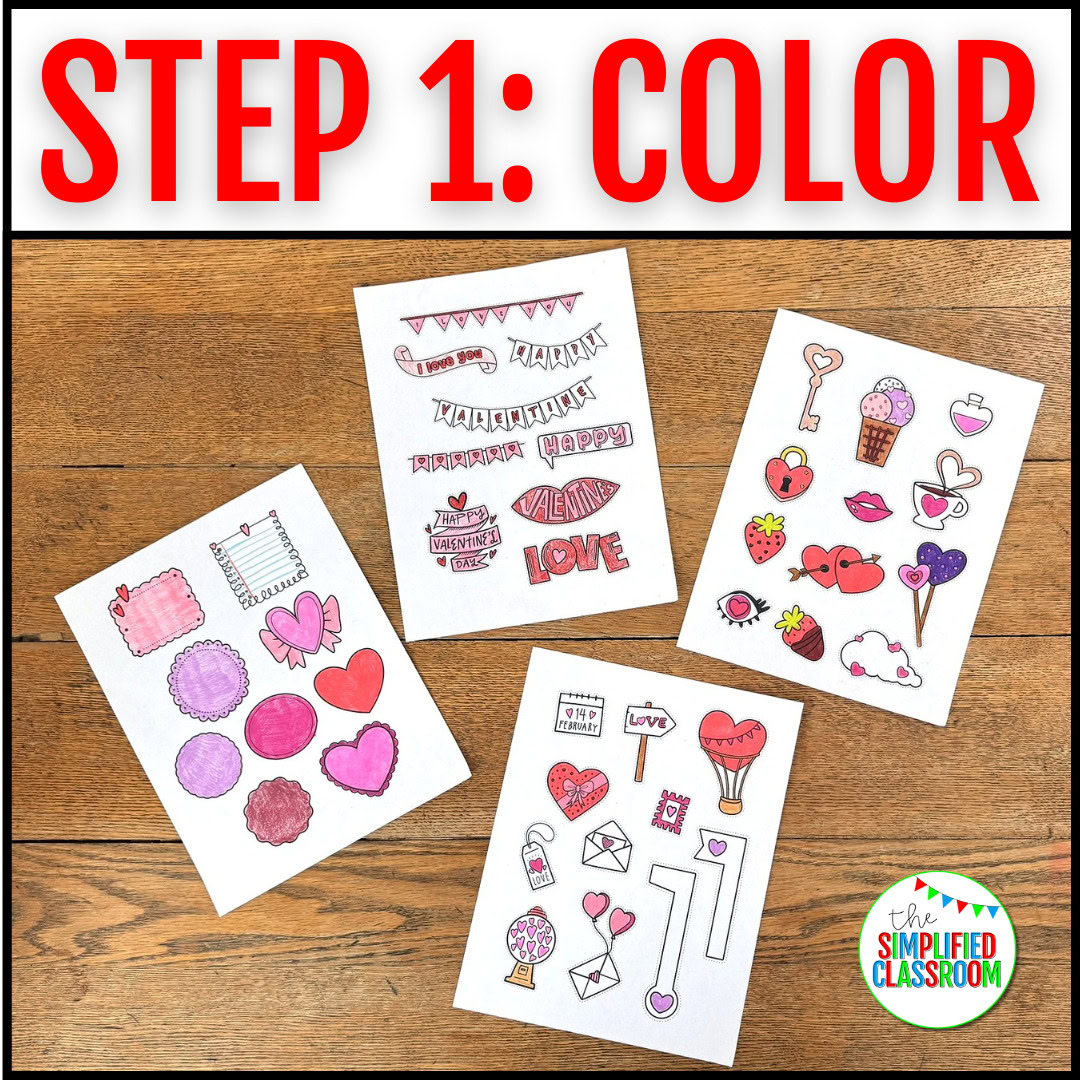Finally, all printables are in black and white for easy coloring, along with flexible layout options that allow students to decorate all sides of their Valentine’s Day paper bag mailbox or just the front.